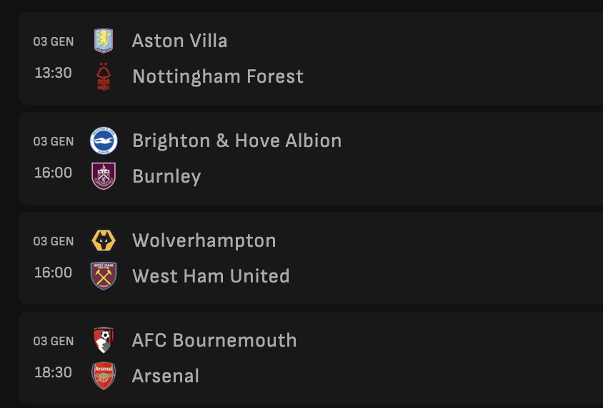 03 Gennaio 2026,ore 7.23 Oggi in campo 4 partite: il dettaglio Quattro partite di Premier oggi cominciando dal lunch match con altri tre nel pomeriggio. Ecco qui sotto il dettaglio